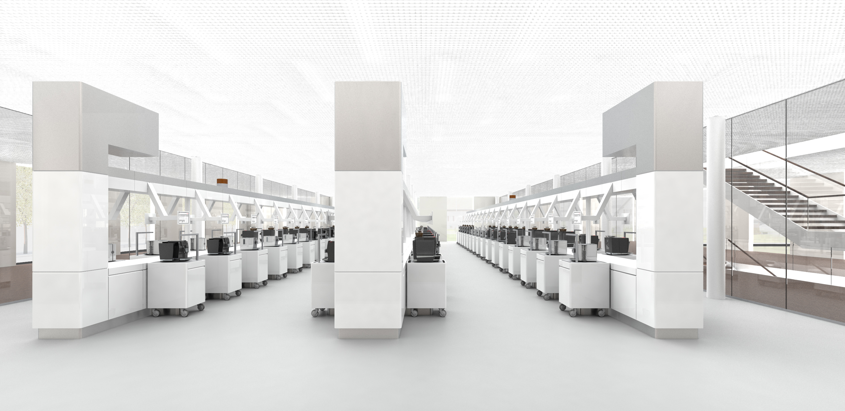 Die komplexen Aufbauten der Anlage sind mit weissem Blech verkleidet. So erscheint die Anlage schlicht und rückt das wesentliche ins Zentrum; den Kaffeevollautomaten im Dauertest.
