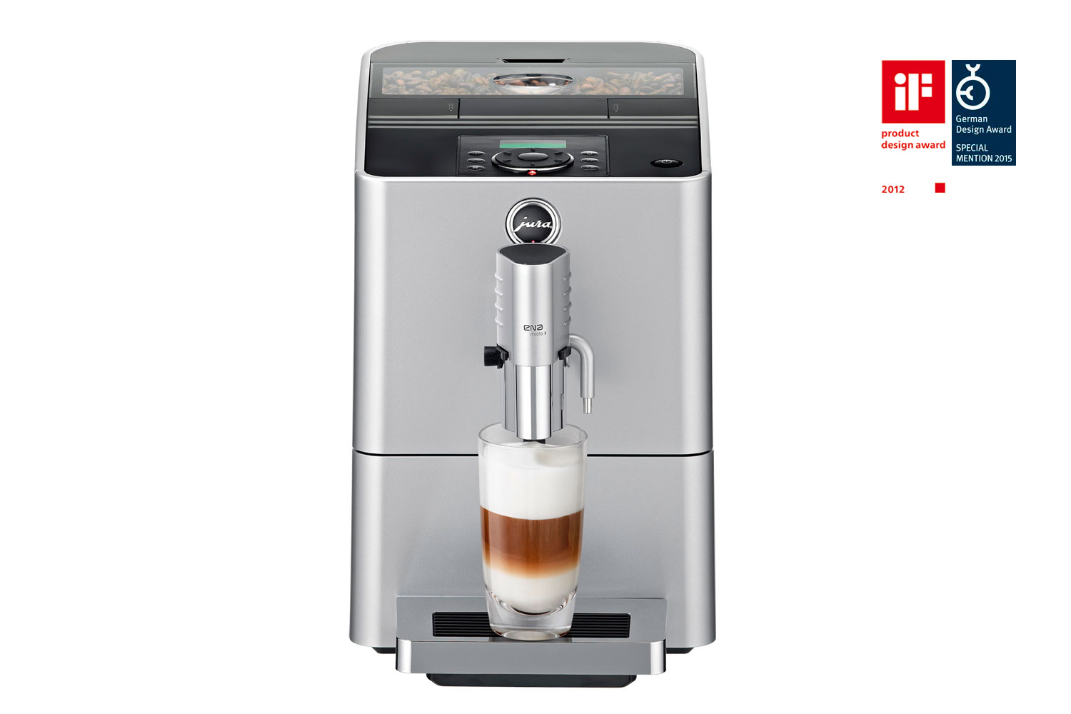 Für Jura entwarfen wir die neue Ena Micro-Linie. Die Ena Micro 9 One Touch ist der kleinste Cappuccino-Vollautomat der Welt. Die schlichte und kompromisslose Formgebung verleiht dem Gerät eine unverwechselbare Erscheinung. Alle Bedienelemente sind auf der gut einsehbaren Geräteoberseite angebracht. Dadurch unterstützt das Design die Benutzerführung, und die Frontansicht erhält ihre schlichte Eleganz, die die Markenwerte der Firma Jura ideal verkörpert. Die Jura Ena Micro 9 One Touch wurde mit dem iF design award 2012 ausgezeichnet.