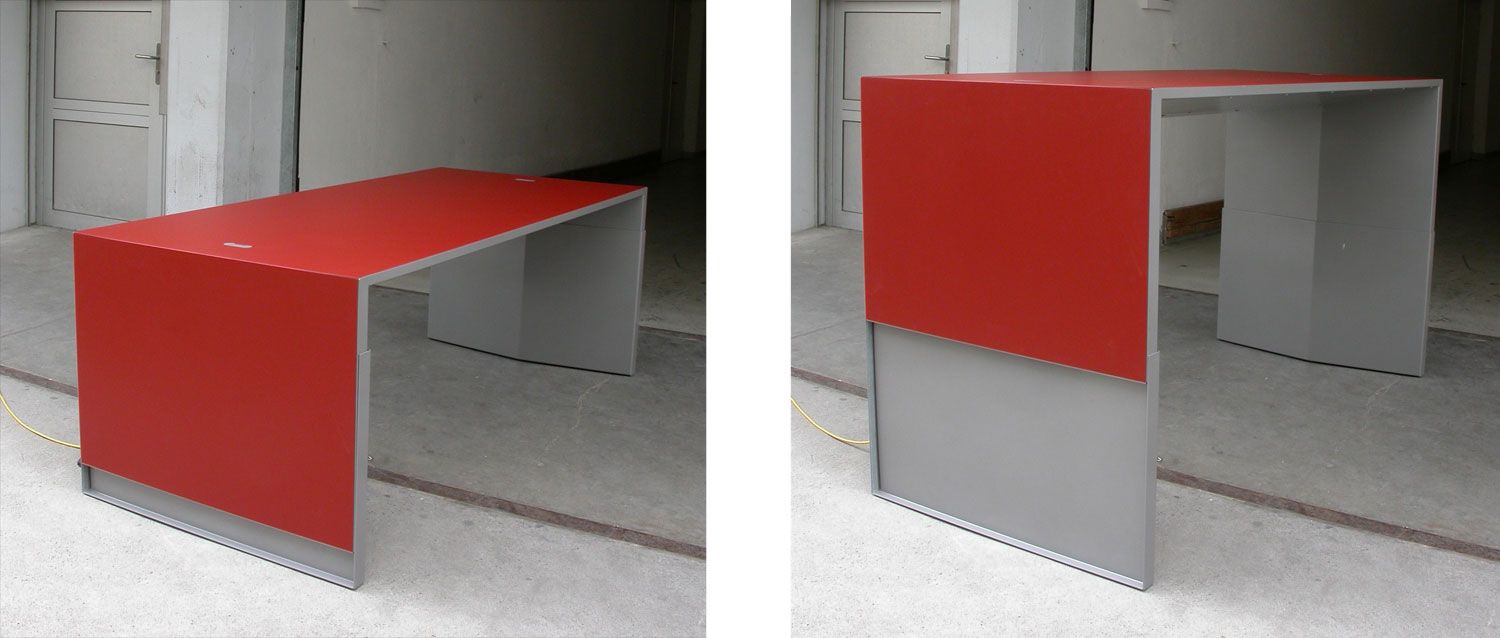 Liftable Das Auf und Ab in der Bürowelt. Der stufenlos höhenverstellbare Arbeitstisch ist eine Eigenentwicklung. Die tragende Aluminium-Blech-Konstruktion verkleidet die Hebehydraulik und den Antrieb. Der Prototyp bewährt sich in unserem Atelier seit 10 Jahren im Alltag.